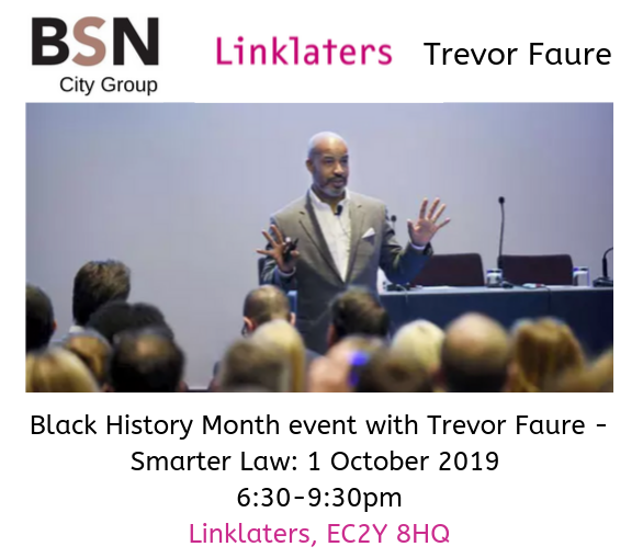 To celebrate this year’s Black History Month, BSN City is delighted to invite you to our event, co-hosted by Linklaters entitled: “Smarter Law: transforming busy lawyers into business leaders” by Trevor Faure, former Global General Counsel of EY and CEO of Smarter Law Solutions.